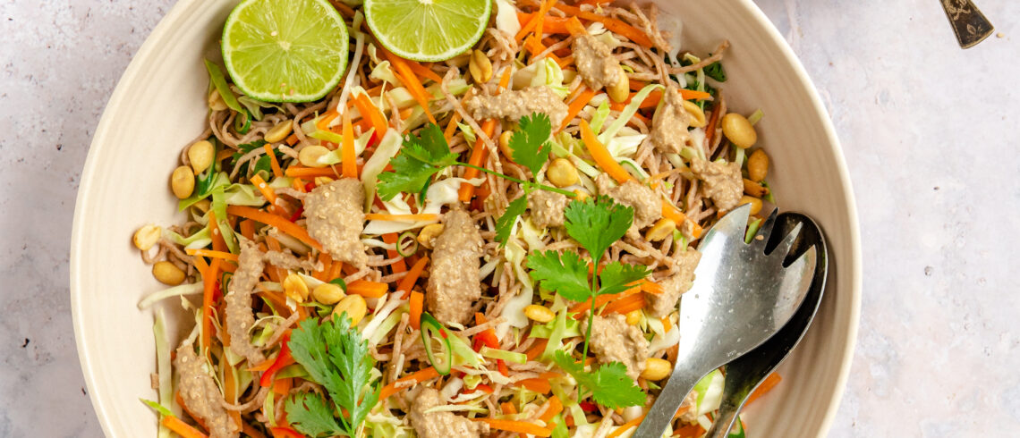 - Kom limesaft ud over, og anret i en skål med gomadressing, peanuts, sesamfrø og resten af korianderne.