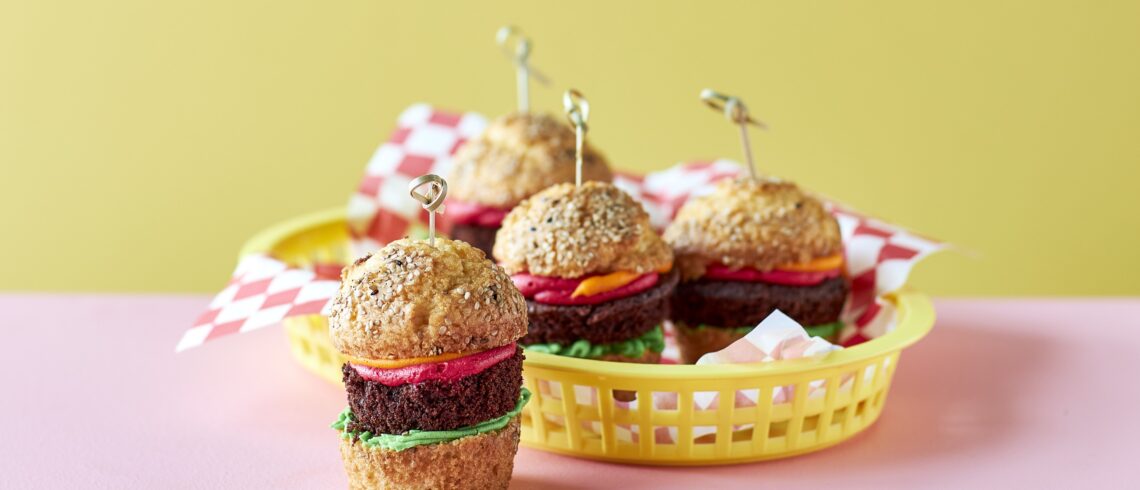 - Sprøjt grøn creme på bundene, og læg en bøf oven på. Sprøjt rød og gul creme på bøffen, og læg kagetoppene på som låg. Sæt en pind i hver burger, og servér.
