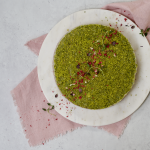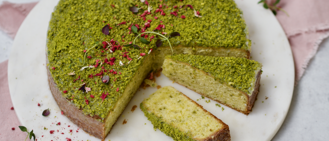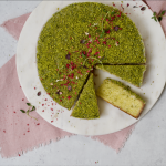 - Hak pistacienødderne mellemgroft, og drys dem ud over kagen.
