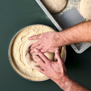 For at få det bedste resultat med høje pizzakanter fyldt med flotte lufthuller, skal du trykke dejen forsigtigt ud med hænderne i stedet for en kagerulle. Et godt tip er at trykke pizzadejen ud i durummel, som er en særlig hvedetype med fin formaling og gylden farve. Den sætter sig ikke ind i dejen på samme måde som almindeligt mel.