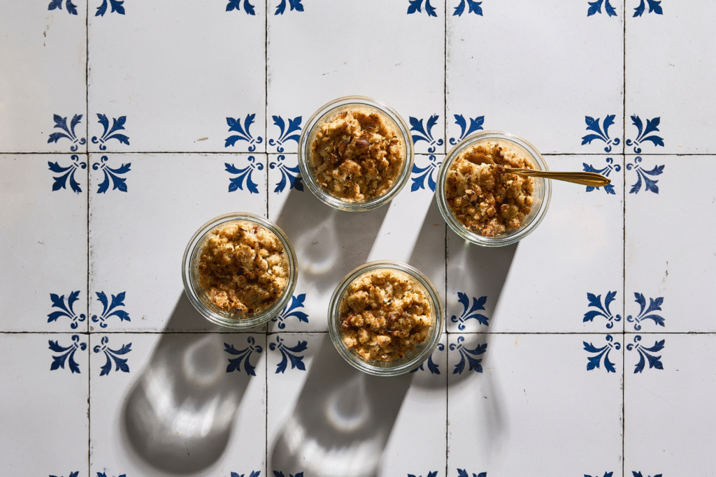 - Smuldr smørret sammen med de to slags mel, havregryn, hakkede mandler, sukker og vanilje. Massen skal være løs og uden store smørklumper.