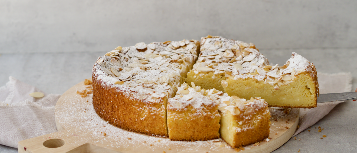- Hæld dejen i en form på 22 cm i diameter, og drys overfladen med mandelflager.