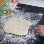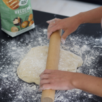 - Hæld dejen ud på et meldrysset bord og rul den ud til ca. 2-2,5 cm. tykkelse.
