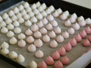 - Fastgør bagepapiret på en bageplade og afsæt små marengstoppe.