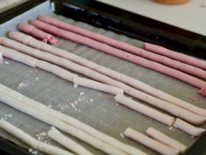 - På et anden bageplade laves lange stave af marengs. Bag dem ved 130°C (varmluft 110°C) i 40-50 minutter, dette afhænger meget af din ovn.