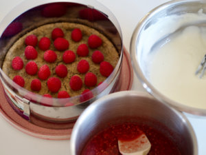 - Placer de friske hindbær på cookiebunden og hæld herefter ostecreme ud over bund og hindbær.
