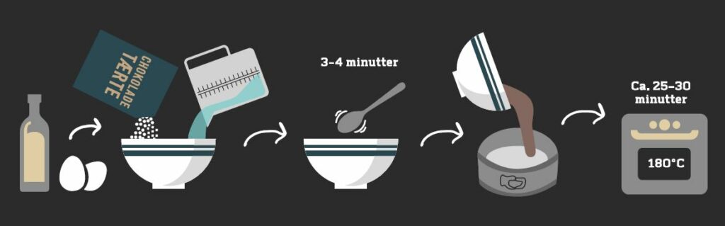 - Hæld posens indhold i en skål, og tilsæt vand, olie og æg.