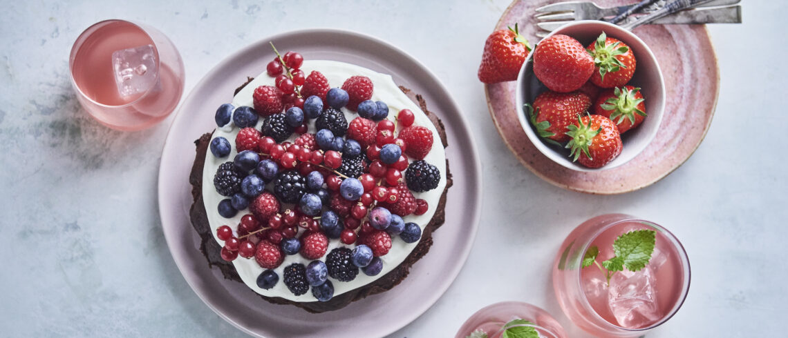 - Pynt den afkølede chokoladetærte med flødeskum og sæsonens bær.