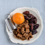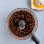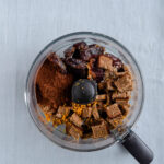 - Kom dadler, rugbrødstern, appelsinskal- og saft, kakaopulver, flagesalt og mørk chokolade i en foodprocessor og blend, til du har en homogen dadelmasse. Sæt dadelmassen på køl i 30 minutter.