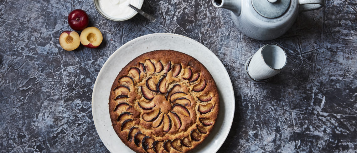- Rengør blommerne og skær dem i mindre både. Fordel blommebådene ovenpå dejen i et flot mønster og tryk dem let ned i dejen.