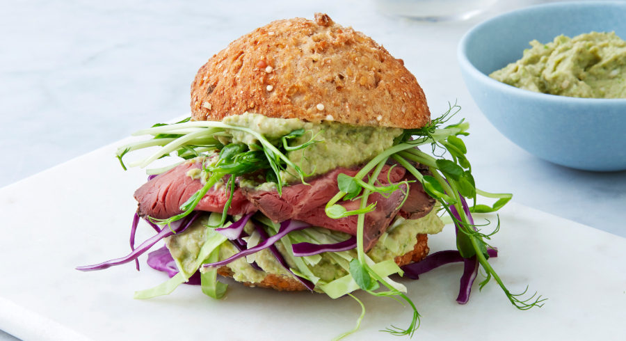 - Flæk proteingrødbollerne, og læg dem sammen med hummus, roastbeef, kål og ærtespirer og servér den resterende hummus til.