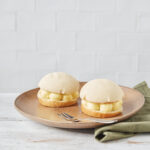 - Skær bollerne over, og læg et stykke frosent stikkelsbær kompot i midten af bollen.