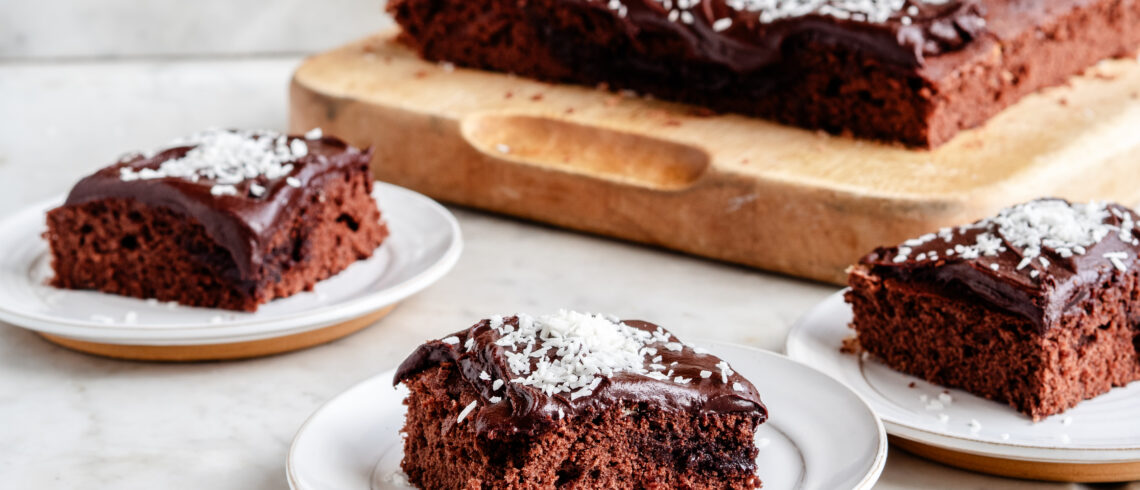 - Bland ingredienserne til glasuren. Når kagen er helt kold smøres glasuren på og der drysses rigeligt med kokosmel.