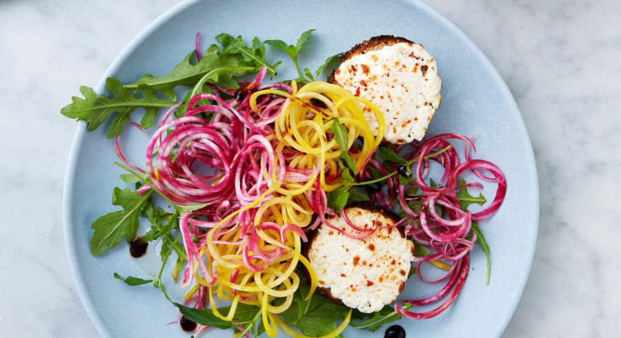 - Grill bollerne til gedeosten er let gylden, anbring bollerne på salaten, dryp honning og balsamico over og drys med pinjekerner.