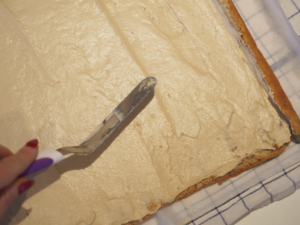 - Smør rouladen op med lakridscreme og træk et stykke bagepapir henover rouladen således at lakridscremen bliver glat.