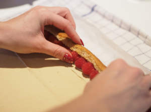 - Placer friske hindbær i den ene ende af rouladedejen, og start med at rulle rouladen sammen her.