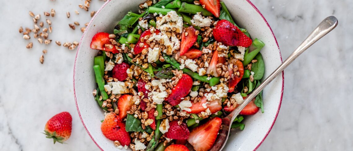 - Kom spinat i en skål, top med asparges, jordbær, poppede rugkerner og feta. Vend det evt. sammen.
