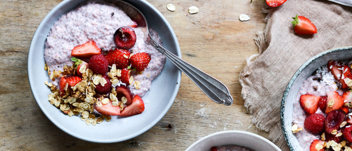 - Top fx grøden med friske bær, mysli, kakaonibs og kokos.
