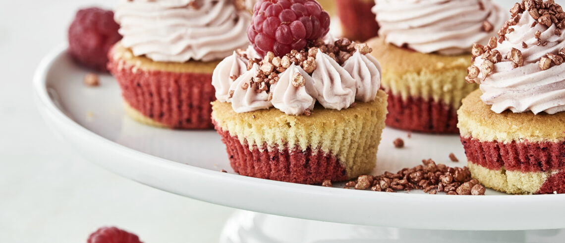 - Fordel skiftevis vaniljedejen og hindbærdejen i muffinformene.