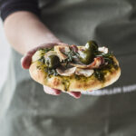 - Pensl morgenbollerne og sandwichstykkerne med æg eller vand, drys bollerne med solsikkekerner og sandwichstykkernerne med græskarkerner. Kom dit ønskede fyld på pizzaerne. Her har vi bagt en børnevenlig med tomatsovs i bunden og toppet med mozzarella, pepperoni og rødløg samt en lidt utraditionel med grøn pesto i bunden og tyndskårne jordskokker, bacon og oliven på toppen.