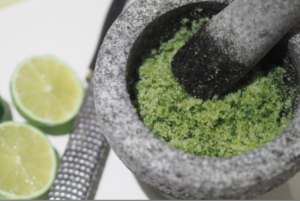 - Riv skallen fint fra limefrugterne, og kom limeskal, sukker og mynteblade op i en morter og mort det godt.