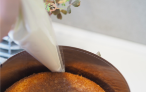 - Placer en kagering (21-22 cm i diameter) omkring kagen og læg kageplast ned langs siden (der skal være knap 1 cm hele vejen rund mellem kagen og kagering.