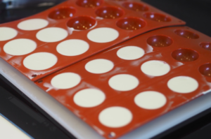 - Fordel lidt af moussen i nogle halvkugleforme af silikone (3 cm og 5 cm i diameter).