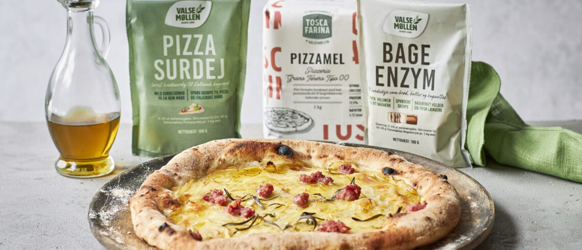 - Kom mel, vand, pizzasurdej og bageenzym i en skål og rør let sammen i en røremaskine. Lad dejen hvile i 30 minutter (fermentolyse).
