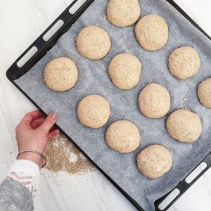 - Pensl bollerne med et sammenpisket æg og drys med quinoa eller andre frø eller kerner.