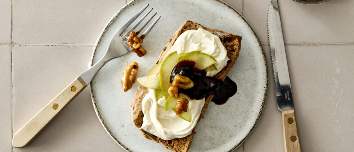 Denne open sandwich med cheesecreme og råsyltede bær er en enkel og elegant fortolkning af den åbne sandwich, hvor det søde og det friske balanceres med cremet flødeost og sprød topping. De råsyltede bær tilfører syrlighed og naturlig sødme, mens pære, valnødder og citronskal giver både struktur og dybde i smagen.