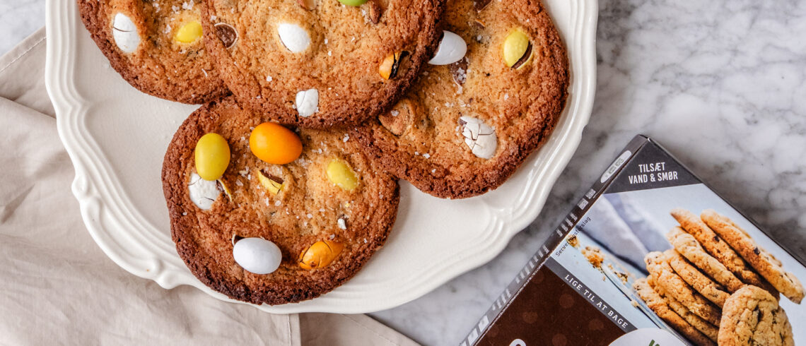 Påske cookies er en nem og festlig småkage, der kombinerer klassiske chocolate chip cookies med farverige påskeæg. Denne opskrift giver sprøde kanter og en blød, chewy midte, hvor chokoladen smelter og tilfører både sødme og variation i hver bid. De hakkede og hele påskeæg giver cookiesene et dekorativt udtryk og en skøn crunch, mens et strejf af flagesalt løfter smagen og skaber balance.