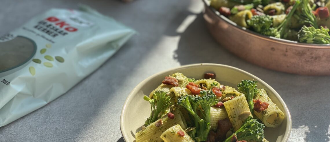 - Vend pestoen sammen med pasta og broccolini til pestoen er godt fordelt over det hele.
