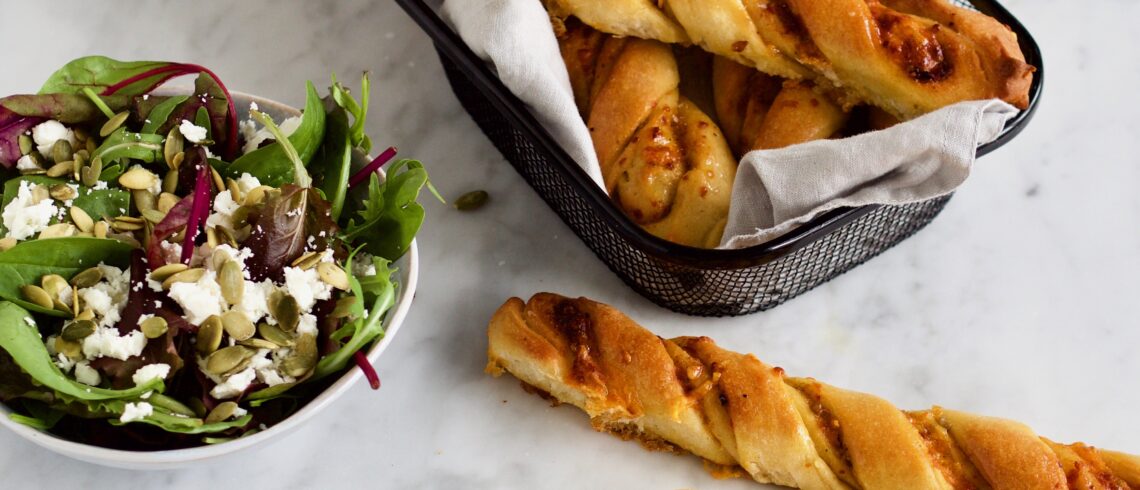 - Sno hver strimmel ved at tage fat i hver ende og rul dejen modsat hinanden, så den får snoninger. Sæt dem på en bageplade.