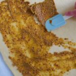 - Smør pesto på, så det er jævnt fordelt. Drys med cheddarost, så det er godt fordelt (Gem lidt til afbagningen).
