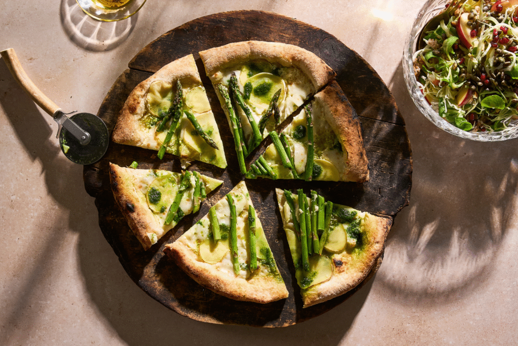 - Smør et tyndt lag cremefraiche på hver pizzabund. Fordel kartofler, asparges og små klatter pesto eller urter. Drys med lidt salt og peber.