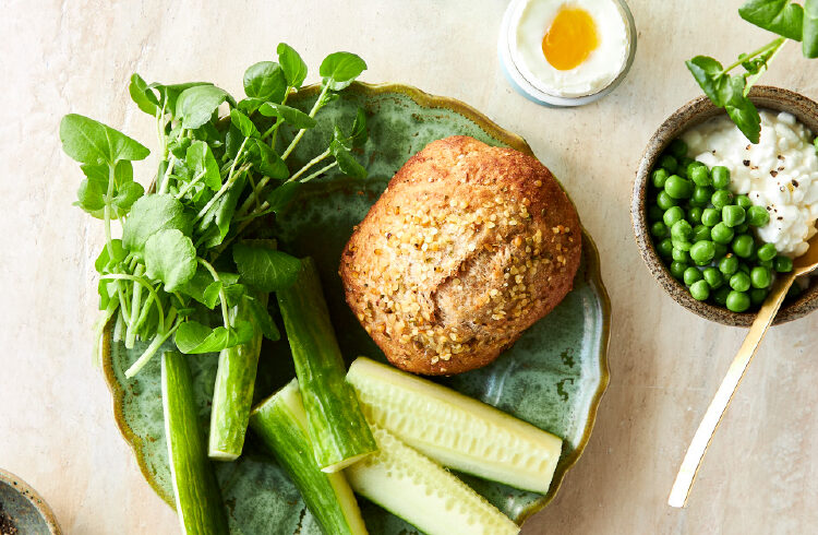 Bag Valsemøllen Proteinboller og server sammen med hytteost, grønt og æg.