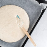 - Smør dejen ud på en bageplade med bagepapir til den ca. måler 30×34 cm.
