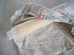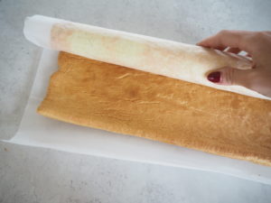 - Når den kommer ud af ovnen, vendes den ud på et nyt stykke bagepapir og rulles med det samme ind i et rent viskestykke. Derefter skal den på køl. På den måde holder den form som en roulade og ikke revner.