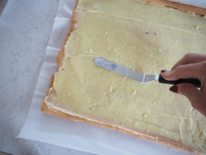- Rul forsigtigt rouladen ud og smør vaniljecreme ud over bunden (gem 2 spsk. til opsmøring af rouladen).
