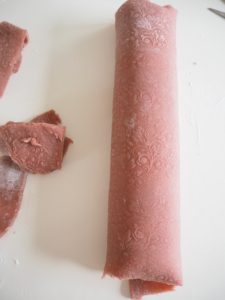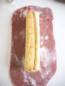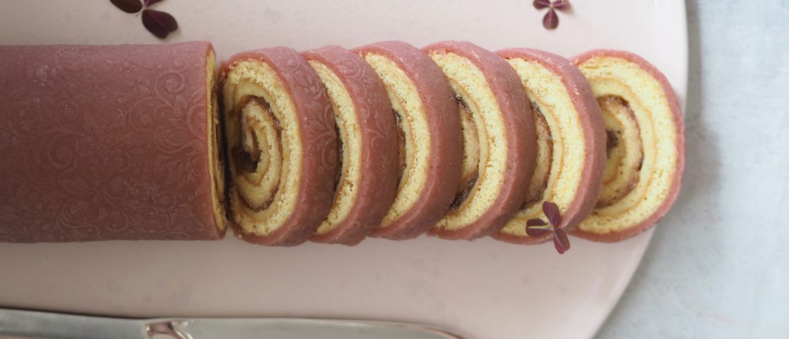 - Ælt farven ind i marcipanen, og udrul marcipanen, så det passer med længden og omkreds af rouladen.