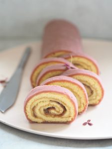 - Smør herefter rabarberkompotten ud over vaniljecremen. Rul rouladen sammen. Fast, men ikke sådan at fyldet presses ud.