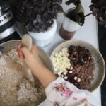 - Tilsæt chokolade og tranebær og bland dejen sammen.