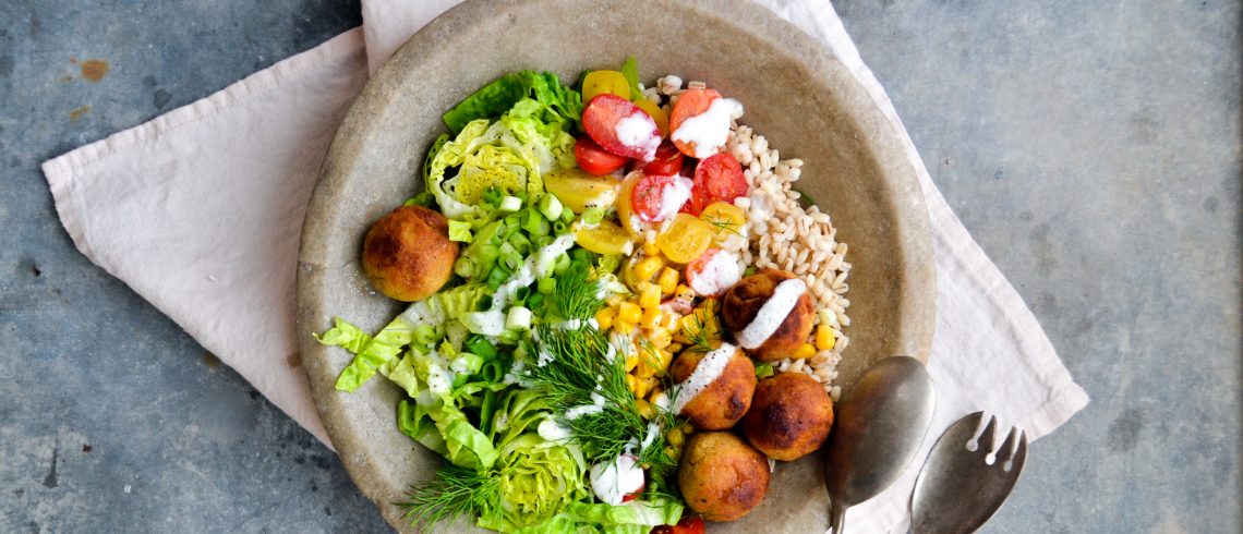 - Byg på et fad salaten op med perlebyg i bunden, dernæst salat, tomater, majs, forårsløg, dild og falafler. Hæld dressingen ud over.