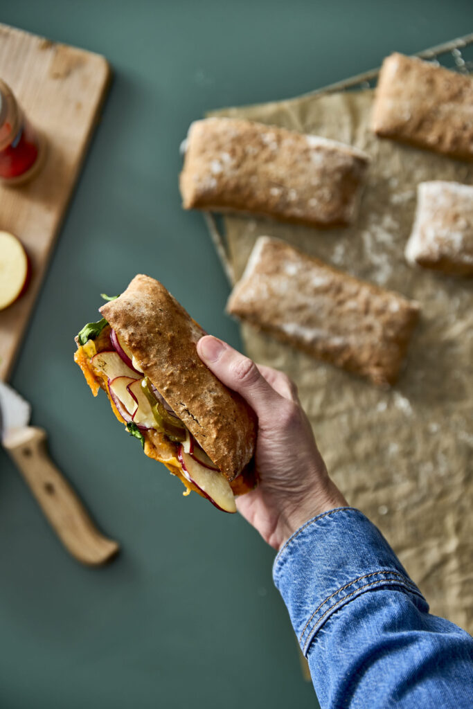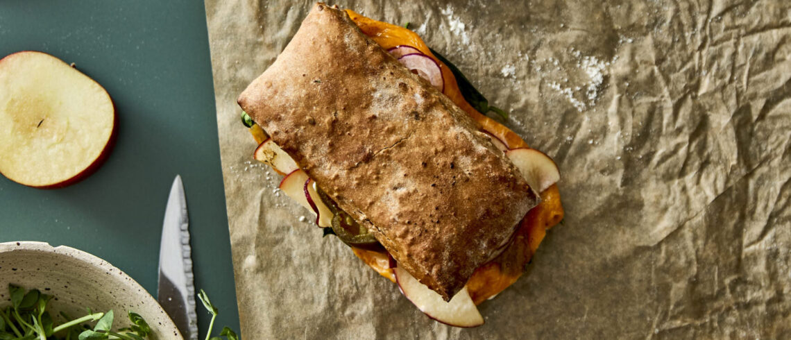 - Luk og rist i en panini-grill eller på en pande i lidt smør, til osten smelter.