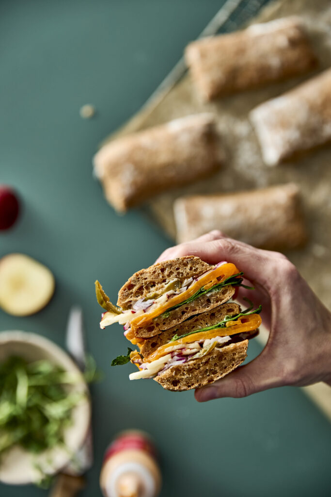 - Skær sandwichstykkerne over på midten, og smør brødene med mayonnaise.