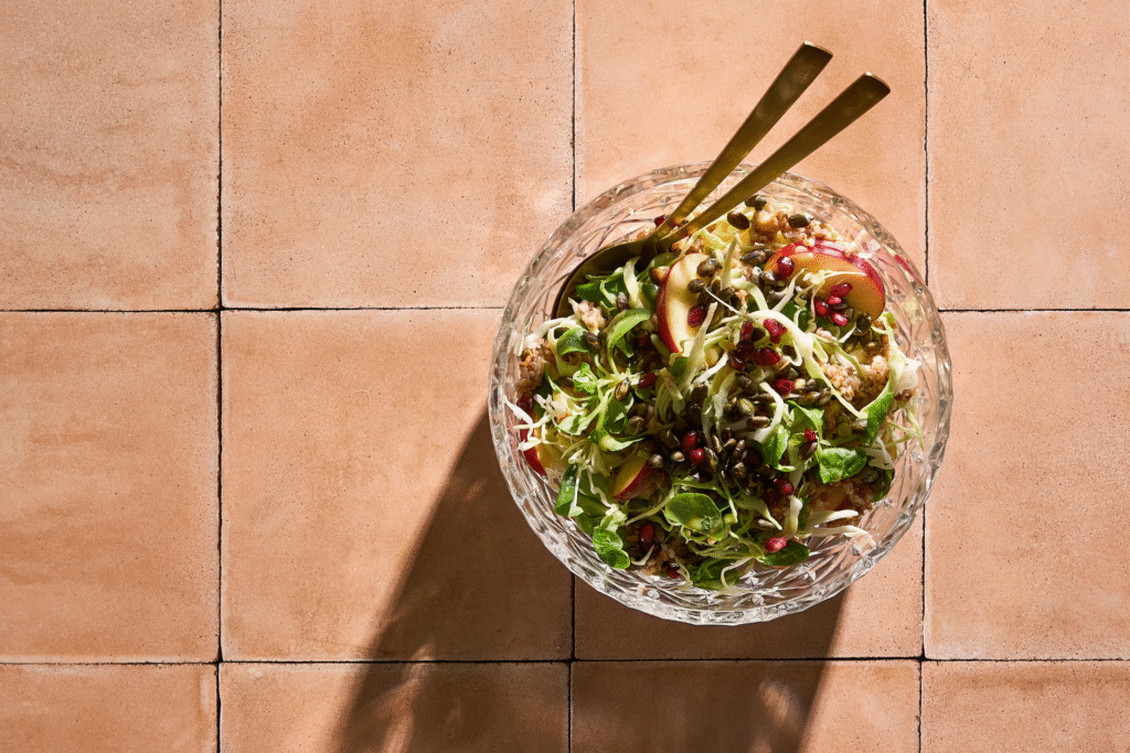 - Vend spidskål, æbler, feldsalat, hvedekerner og granatæble i en stor skål.