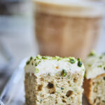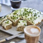 - Smør frostingen på den afkølede kage og pynt til sidst med hakkede pistacienødder.