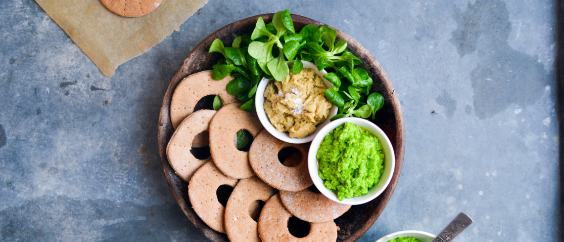 - Læg knækbrødene på en bageplade beklædt med bagepapir, prik huller i knækbrødene med en gaffel og bag dem i ca. 12 minutter.